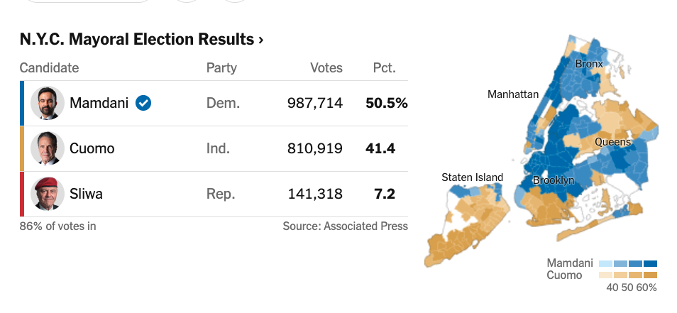 Mamdani's victory caps a meteoric rise, propelled by a progressive platform focused on affordable housing, public safety reform, and economic equity. With polls closing at 9:00pm ET, early results showed Mamdani surging in Manhattan, Queens, Brooklyn, and the Bronx (leading by 20–25 points), while Cuomo held a slim edge in Staten Island. Final tallies, including early votes from over 732,000 ballots (65% of 2021's total), confirmed Mamdani's lead at 43% (Quinnipiac poll), Cuomo at 33%, and Sliwa at 14%, with 6% undecided.