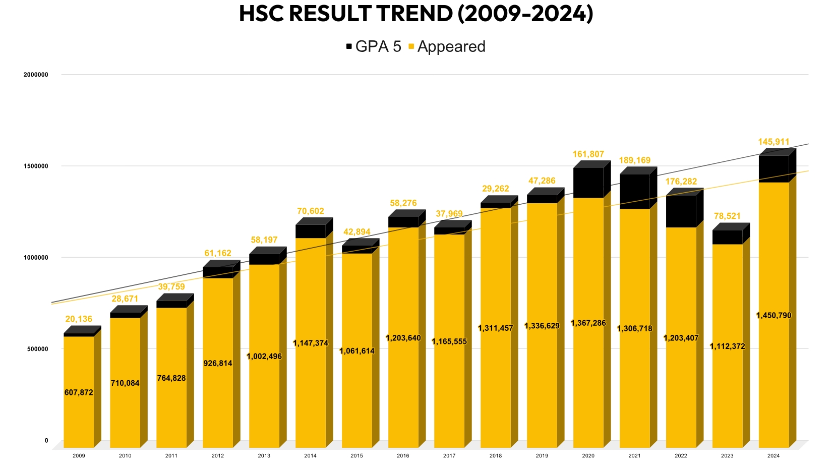Data from the past fifteen years tell a clear story of how the number of GPA-5 achievers has risen, dipped, and spiked in ways that have little to do with genuine academic progress. In 2009, just over 20,000 students achieved the top grade. By 2014, that number had climbed to more than 70,000. Then came 2020, the year of the pandemic, when no public exams were held. Yet a record 1.6 lakh students received GPA-5 based on previous performances and internal assessments. The following years continued this inflation, with 1.89 lakh in 2021 and 1.76 lakh in 2022, before the figure adjusted slightly to around 78,000 in 2023. In 2024, it shot up again to nearly 1.46 lakh students.